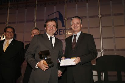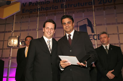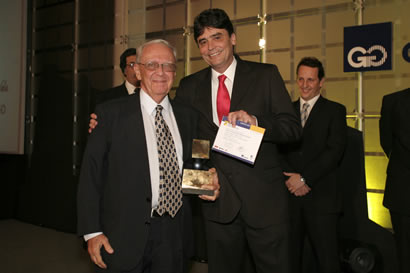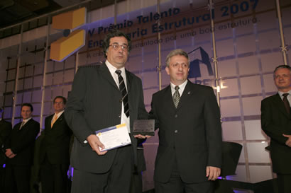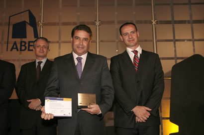 Placa e certificado de menção honrosa foi recebida pelo eng. José Luiz Varela (à esq.), representante do eng. Aluízio D´Avila, das mãos do vice-presidente da ABECE eng. Marcos Monteiro