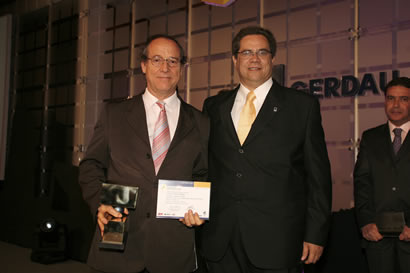Eng. Gilberto M. B. do Valle (à esq.) receber prêmio das mãos do Diretor Comercial da Gerdau Aços Longos Gerson Marcos Venzon
